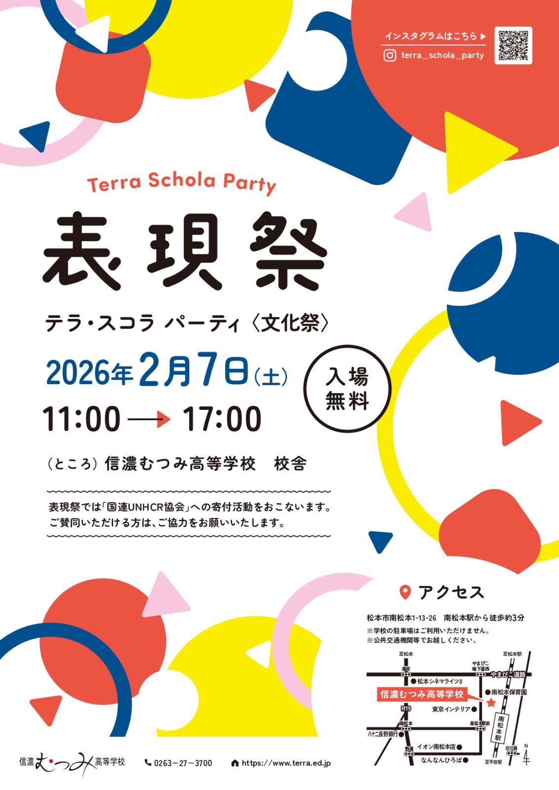 当日は、多種多様な企画が揃っています。生徒・保護者の方はもちろん、南松本とその周辺地域の方や入学を検討されている方、本校活動に興味のある全ての皆さま、どうぞこの機会にご来場いただき、テラ・スコラパーティ~表現祭~をお楽しみください。